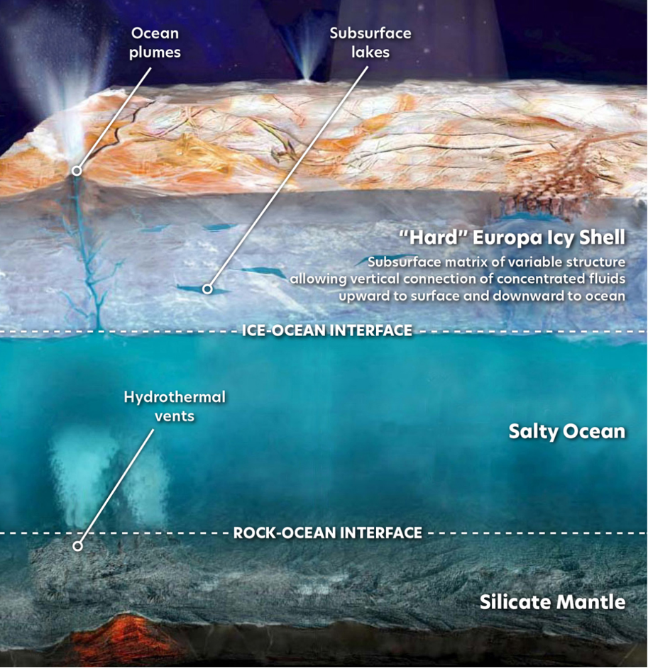 木卫二(Europa)是一颗和月球规模接近的天然卫星,表面被冰层覆盖,其下存在巨大的全球性海洋(图 2)。如果更早确认这种具备全球性液态水海洋的天体,我相信会催生出更多的科幻电影。