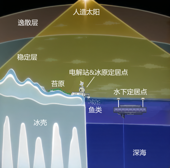 在生态方面,投放苔原植被和南极磷虾。人类居住区则设计为水下建筑,以利用厚重的水层屏蔽木星强大的辐射(图 4)。