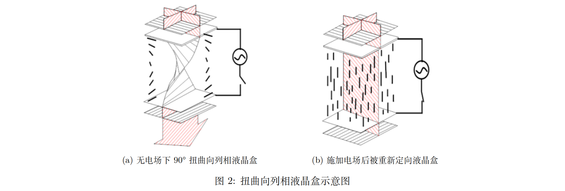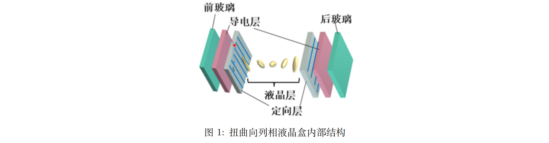 扭曲向列相液晶盒的上下两个基片的取向成一定扭转角度,液晶分子在两个基片之间成分层排列。在同一层内,液晶分子具有相同的取向,并与层面平行。由于分子间范德华力的作用,相邻层之间的分子取向逐渐发生变化,从而形成了扭曲向列相的排列方式。值得注意的是,扭曲角度在这种结构中是可以人为控制的(与胆甾相液晶不同,胆甾相液晶的螺距是不可控的)。扭曲向列相液晶盒的内部结构如图1所示[[11]]: