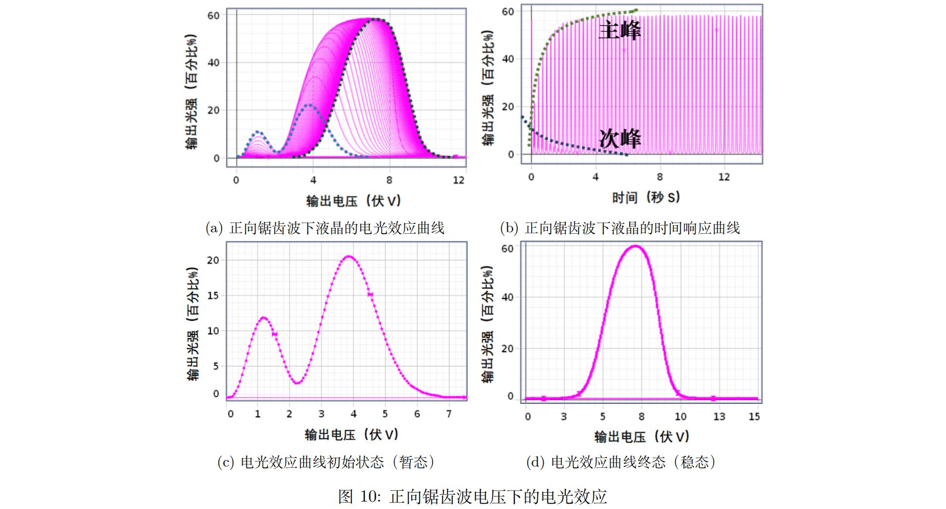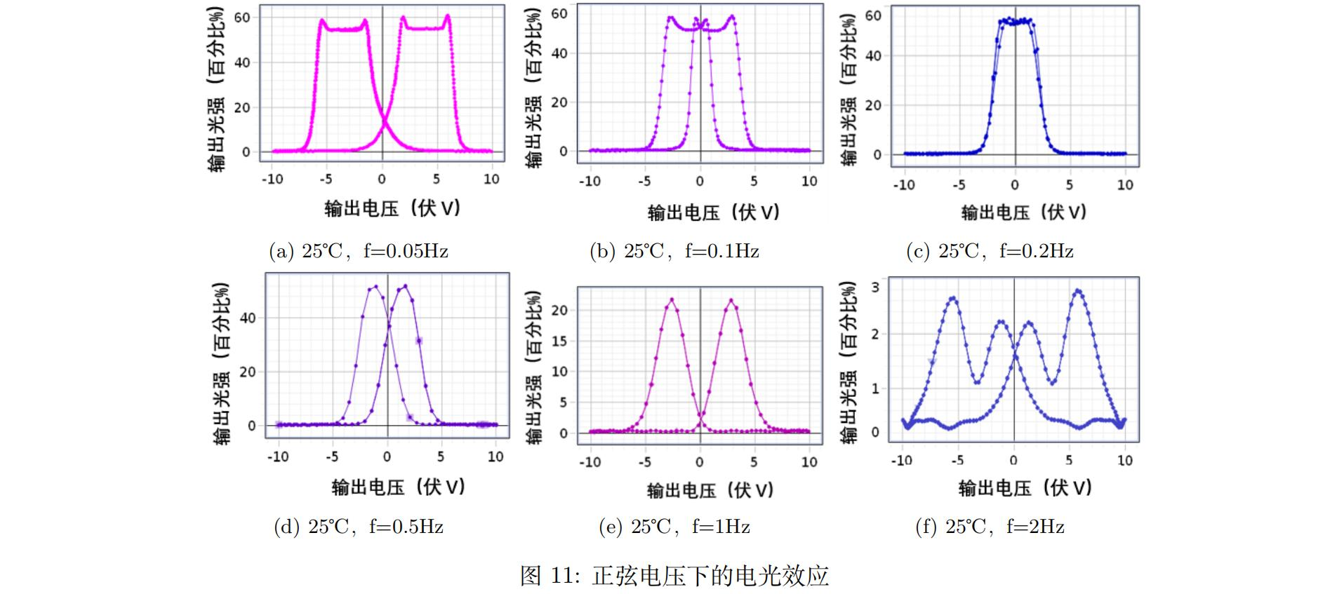 直流电压驱动下阈值电压和关断电压的数值,大致为2.5V和10.5V。在该电压范围内,输入光强不变的情况下,输出光强发生振荡。正向锯齿波电压驱动下出现主峰和次峰,次峰与主峰的产生是挠曲电效应和介电效应此消彼长的过程,即液晶表现出一定的弹性,而越低频的电信号下液晶的“弹性恢复”就越明显,电光效应是非线性且存在“暂态”和“稳态”,液晶分子恢复原状的“弹力”是逐渐增加的。正弦波电压驱动下,交流电频率影响液晶的阈值电压和输出光强大小,在较小交流电频率下电光曲线出现“猫耳朵”的现象,对应电压为该交流电频率下的液晶阈值电压。在高频率交流电调制下,“猫耳朵”消失。液晶等效光轴的自发转动效果逐渐不明显甚至消失,可以理解为电压在与液晶弹性恢复力的竞争中占据了绝对主导地位,因此液晶在阈值电压处的转动被抑制。