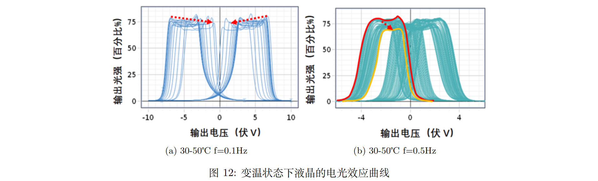 在图12中,我们保持电压振幅为10V下,P2P3偏振正交的条件下改变温度从30℃测量到50℃,测量输出电压与输出光强的关系。图12(a)(b)中可以观察到在保持频率不变的情况下,发现在30℃到50℃升温过程中“猫耳朵”相互远离,而输出光强存在非单调的增长趋势。这说明温度在阈值电压处振荡的过程中存在影响液晶分子取向而导致出射椭圆偏振光等效光轴变化,进而导致其与阈值电压处摆动的耦合存在另一振荡。图12(b)中0.5Hz下本身“猫耳朵”现象已经消失,然而在温度的增加下又重新出现该现象,说明纵使在高频率的电压调制下,等效光轴的自发转动效果逐渐不明显甚至消失,即电压在拨动等效光轴时占据了绝对主导地位,在阈值电压处的自发转动被抑制,由于温度的作用却会导致液晶等效光轴粘性减弱从而促进自发转动的,导致削弱电压的主导地位,从而使“猫耳朵”现象复现。