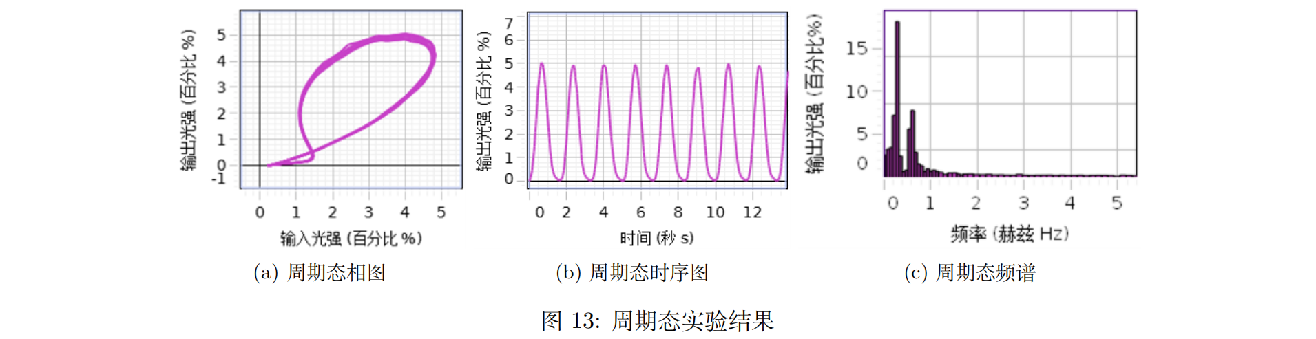 当光强大小在非振荡区间时,由于我们输入的反馈电压具有自身迭代的周期性,其周期行为与电机转动产生的周期相叠加就产生了双周期。如果反馈公式产生的与电机转动产生的峰谷值出现的时间相同,周期也相同,那么就会进入单周期。双周期的图像特征是两个相邻的峰高度不一样,而单周期在时序图中则显示单一峰值。双周期态相图、时序图和频谱如图13(a)-(c)所示