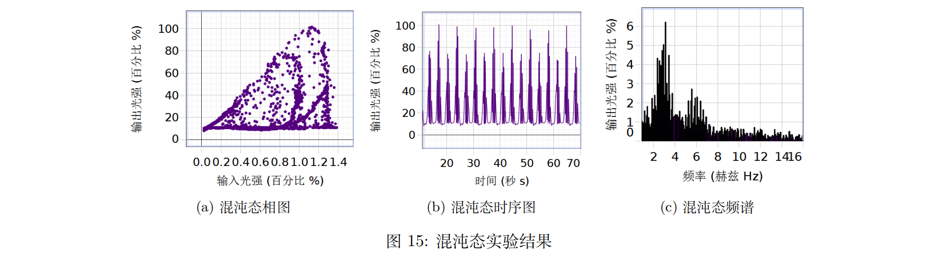 当双周期的两个高低光强峰值都达到了振荡周期的光强区间,则整体系统进入混沌态,如图15所示。此时整个系统呈现周期性的密集光强峰值分布。可以看出来它有一个特征峰,且有连续功率谱,这表明它是一个混沌态。具有混沌特征的运动的相图中运动轨迹局部不稳定,但全局拘束在一个范围内,图中的相图中可以看到它始终没有走出双稳所框定的区域。而且围绕上下两个稳态,相图里输出光强的轨迹线反复在高输出和低输出之间横跳,且相比双稳态时最高的输出位置的距离与最低输出位置的距离每次都不尽相同,有的超过了有的没有达到,也就是说,围绕着双稳态的上下个输出状态,混沌图像中的输出光强具有随机性,每次距离最高输出和最低输出的距离都有差别,甚至可能在中途就往返。