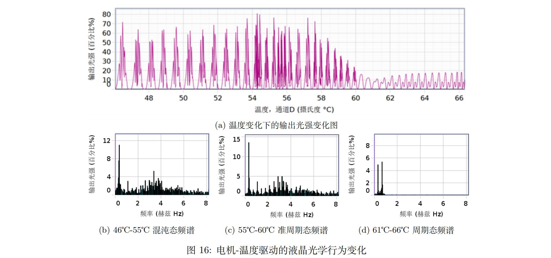 当我们在输入反馈电压的同时,在常温下将偏振片角度调至振荡区间,输出光强的时域图显示了图像处于密集振荡分布的混沌态;与此同时,我们开始使用制热片加热液晶盒温度,使其一直处于混沌。我们发现当温度升高到55℃以前一直保持混沌状态;在55℃到60℃时,输出光强的状态从混沌态变为了准周期态,;进而随着温度的继续升高,输出光强从61℃开始变为周期态,同时输出光强的大小也有所减小。我们解释首先由于液晶在高温环境下无序度增加,导致其总透射率降低,使得光强峰值退出前文提到的“振荡区间”,于是得到了图16中的结果。而当温度重新下降的时候输出光强又会重新进入了混沌,说明只要在温度没有超过液晶分子的破坏上限,液晶的自恢复能力和弹性与外界温度的激励作用有关。