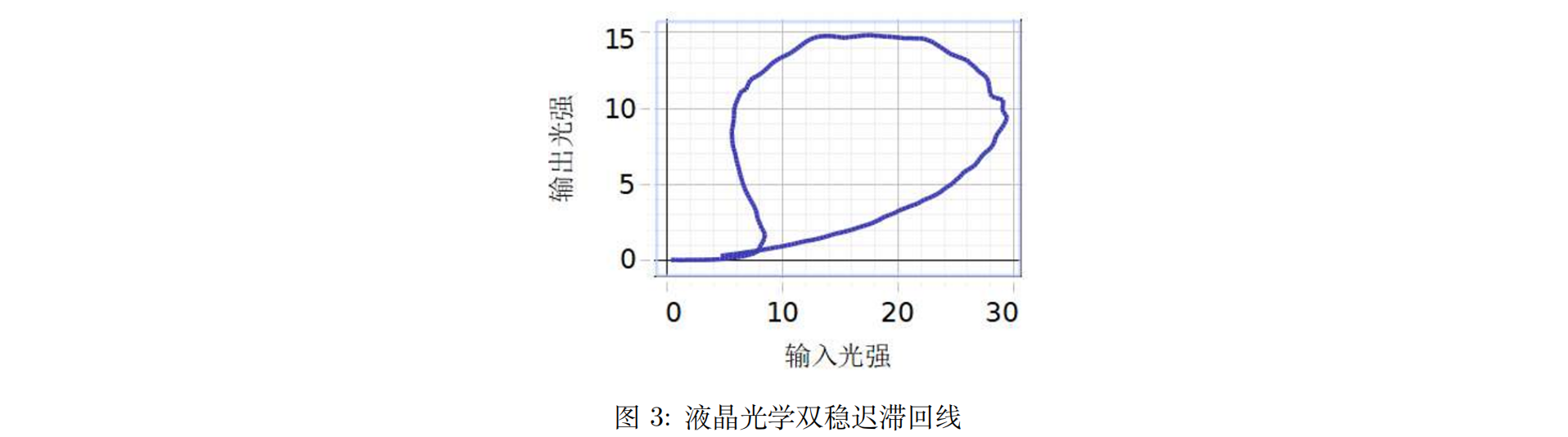 迟滞回线内部的闭环为双稳区。双稳区是系统表现出两个稳定输出状态的输入强度范围。这个范围是由材料的非线性响应、反馈机制和系统的运行参数决定的。双稳性通常发生在具有非线性光学响应的材料或系统中。这意味着输入光强和输出光强之间的关系不是简单的线性关系。在非线性材料中,折射率或吸收系数的变化取决于入射光的强度。在非线性介质中,折射率可以随着通过它的光的强度而变化。这种变化可能是由于各种非线性效应,如克尔效应,其中折射率随光强的平方而变化。