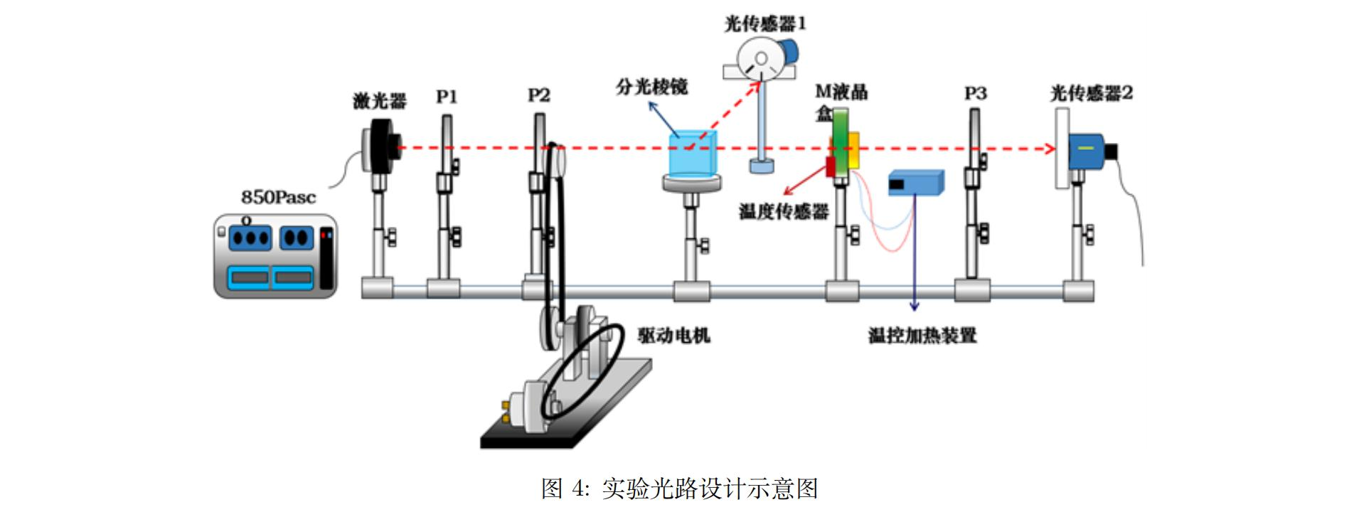 实验仪器包括:625nm红光激光器,P1、P2、P3是偏振片,M为40度扭曲向列相液晶盒,温控加热装置(Pi加热片和温控仪),驱动模块(包括电机、传动轮和履带)光传感器,光学平台,PASCO’850数据接口,计算机软件 PASCO’ s Capstone。