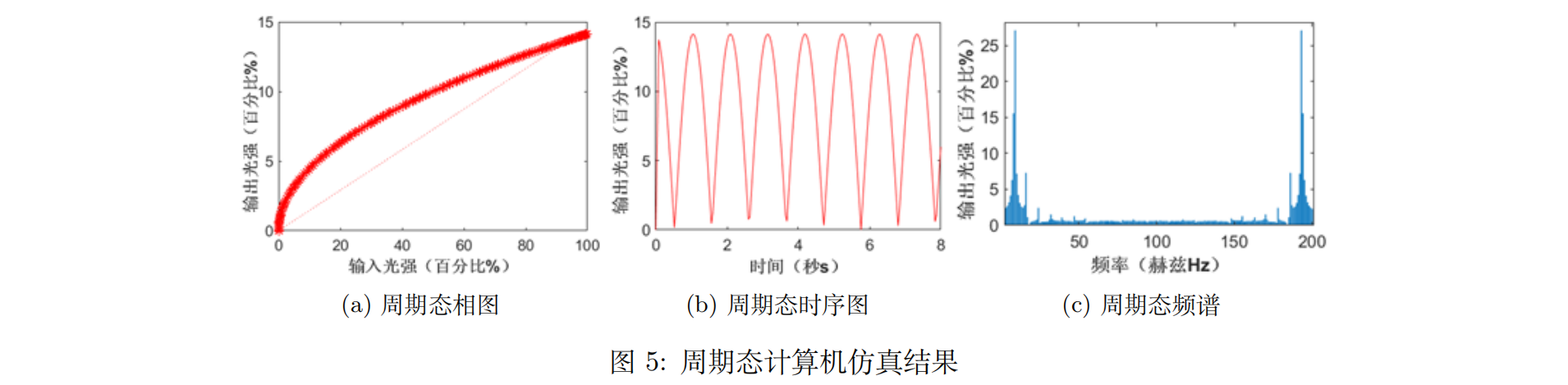 周期态计算机仿真结果如图5(a)-(c)所示。通过周期态的傅里叶变换的频谱我们可以明显看到输出光强在两个不同大小的频率中具有特征峰,而在其他频率范围中几乎没有输出光强,因此我们可以判定这是一个双周期态。相图和时序图也展示出这是周期态。