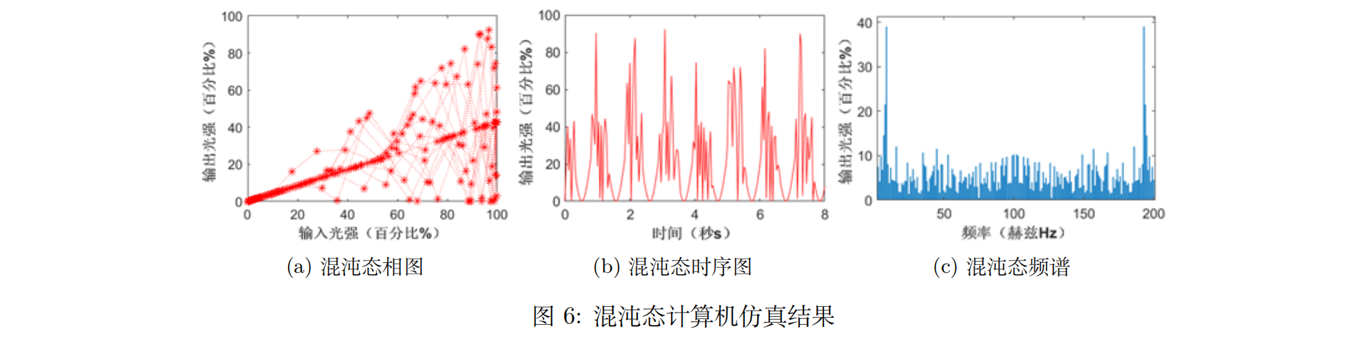 混沌态计算机仿真结果如图6(a)-(c)所示。通过混沌态的傅里叶变换的频谱我们可以明显看到输出光强除了有两个不同大小的频率的特征峰以外,其他频率范围中也存在这大小不一的输出光强。结合相图可以发现光强有填满整个区域内的趋势,时序图中也表现出了每个周期的特征峰值,因此这是一个双吸引子混沌态。