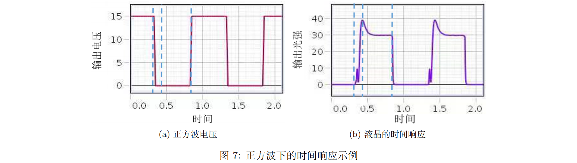在图8中所示电压作用下,随着时间的增加,液晶的透过率发生了反弹。我们知道,在大电压下,液晶分子的取向逐渐与电场方向一致,即逐渐失去了旋光特性,因为检偏器与起偏器成正交,此时输出光强信号微弱。这个过程是非常迅速的。
