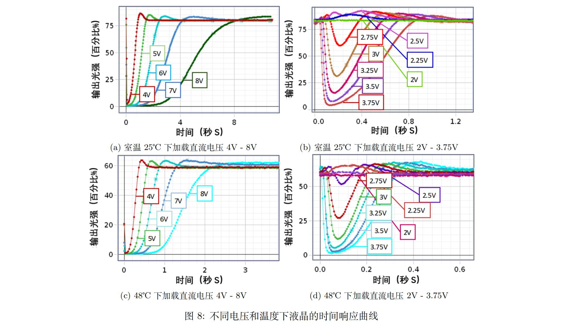 本实验首先在不同温度下给液晶施加了2V - 8V的电压对液晶分子特有的振荡特性进行了探究。当施加直流电压时,由于电场与液晶分子间的相互作用会产生图8中振荡的现象。在(a)中施加8V - 4V的电压时可以看到在较小时间范围会存在一个上下起伏的输出光强大小,这一时间范围随着电压每隔1V的减少而缩短并且左移;同时振幅也随着电压的减小而增大。在(b)中由于微小电压的变化对液晶行为的影响更为显著,于是采取了更为狭小的电压间隔,每减小0.25V测一组输出光强形态。可以看到从3.75V - 2V的电压减小过程中,存在振荡振荡振幅不断减小直到保持全透光常亮的状态。同时可以发现在2.75V附近的光强振荡最明显,拥有两个明显的波峰。对比(a)(b)图可以看到在5V之后输出光强的起始点由常亮的75%(为了观察到输出光强的振荡现象而通过调节p1进行减光防止过曝)状态减小成了<10%,这体现了液晶存在阈值电压和关断电压的特性。