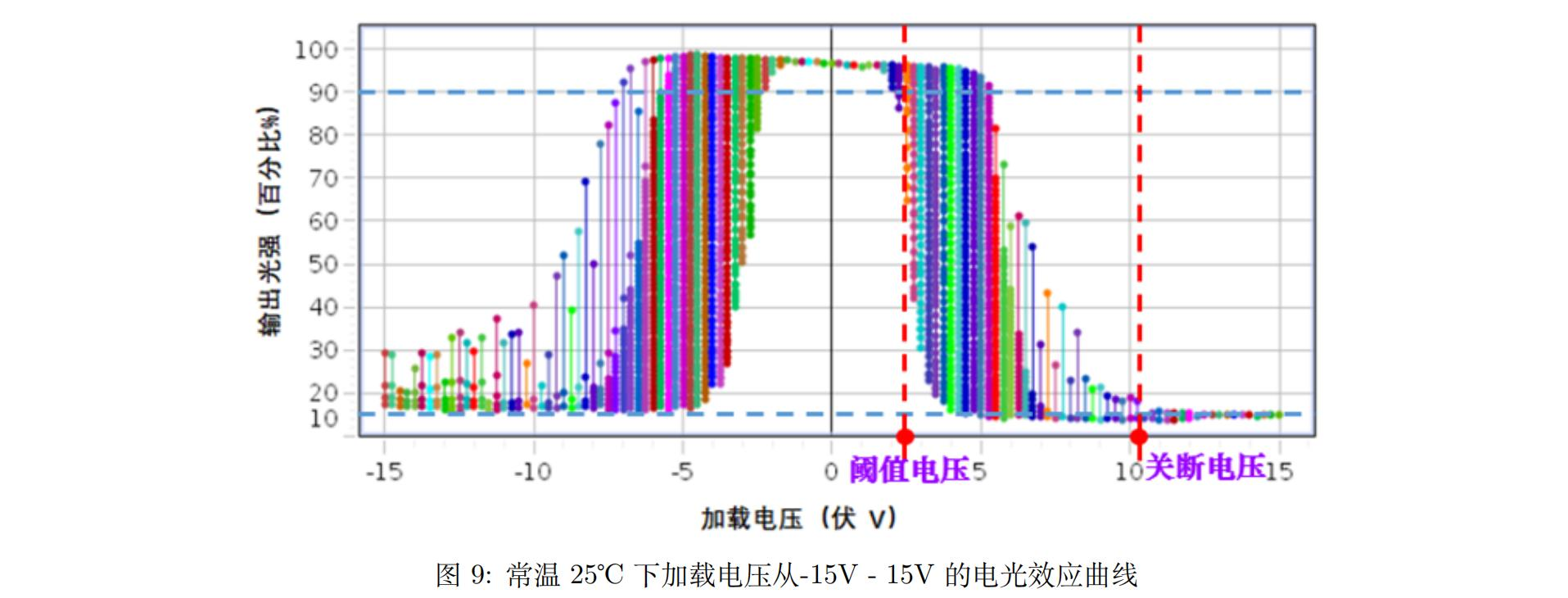 液晶具有“光开关”的特性,即液晶透射率存在阈值电压和关断电压。阈值电压的定义为液晶透过率为90%时的驱动电压;关断电压的定义为液晶透过率为10%时的驱动电压。在阈值电压处,外界电压的大小达到平衡液晶弹性恢复力的大小,从而开始扭转液晶角度,从而导致液晶透射率的变化;进而,液晶扭转力也在不断增加,与外界电压保持动态平衡的状态直至电压足够大,开始主导液晶的排列方向。